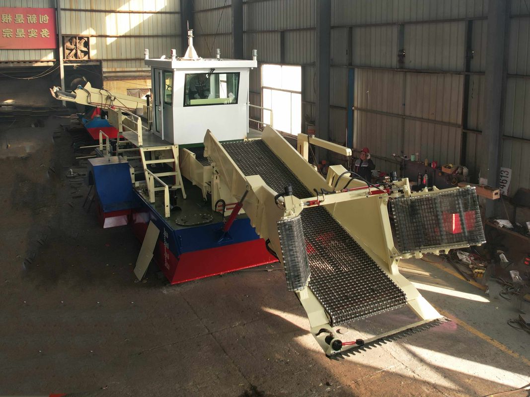 Chinese made hydraulic aquatic plant harvester with high cutting capacity featuring an innovative 3-section rod structure that integrates front collection cabin, middle storage cabin, and rear storage/unloading cabin for streamlined operations.